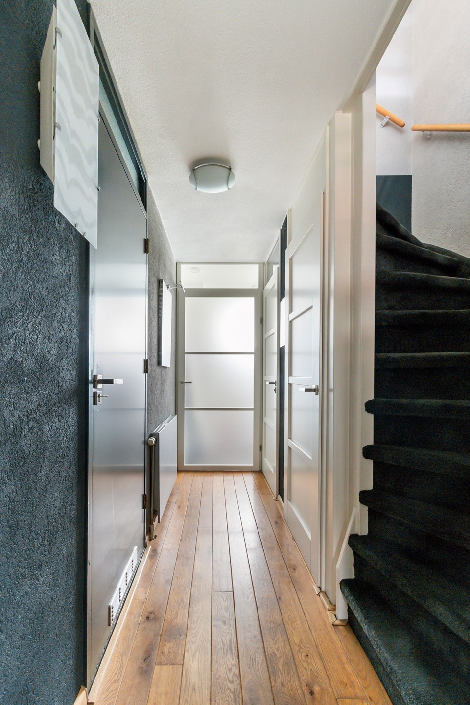 De entree met garderobe en meterkast staat in verbinding met de hal. De hal geeft toegang tot de trap naar de 1e verdieping, de voorraadkast onder de trap, het toilet, de wasruimte en de inpandige garage.