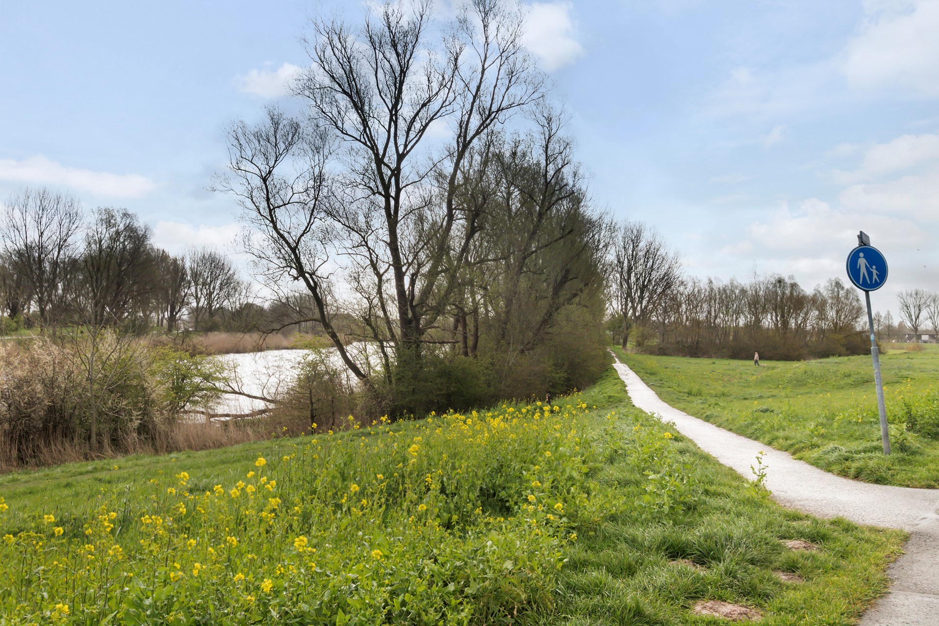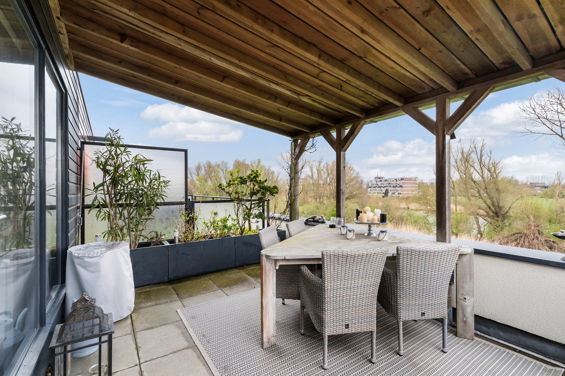Het dakterras aan de achterzijde is vanuit de overloop bereikbaar. Wat heeft u hier een geweldig uitzicht! U kijkt mooi uit over het groen van de Wantijdijk en het riviertje de Wantij. Het afdakje zorgt voor extra comfort.