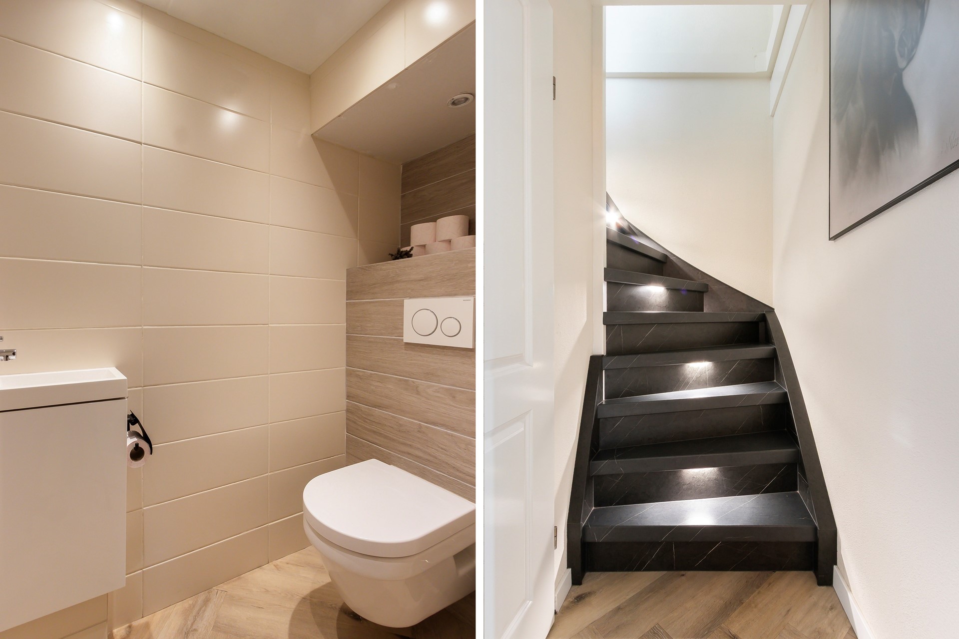 Tussen de keuken en de woonkamer is er een extra halletje; deze geeft toegang tot het moderne toilet (2021) en de trap naar de eerste verdieping.