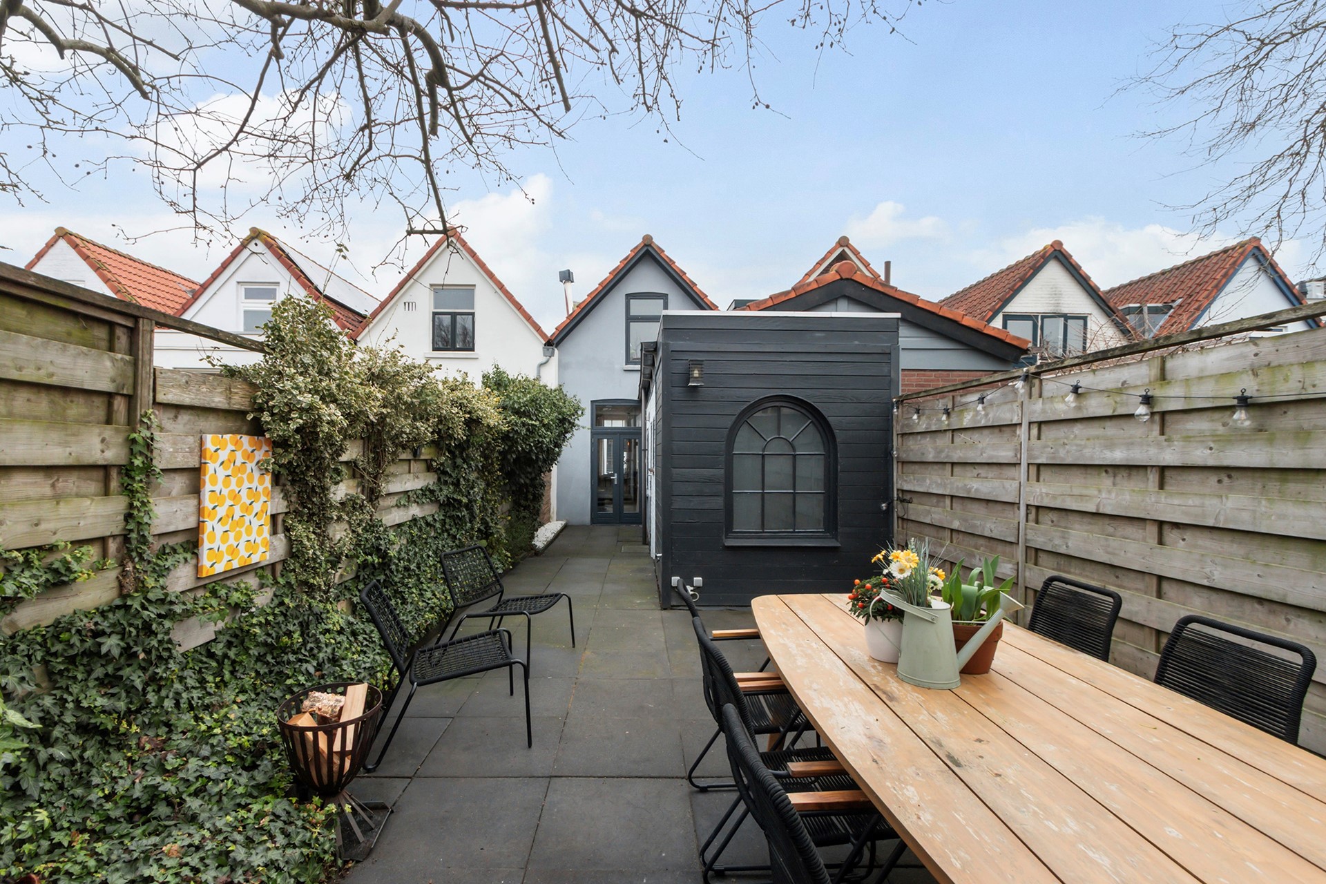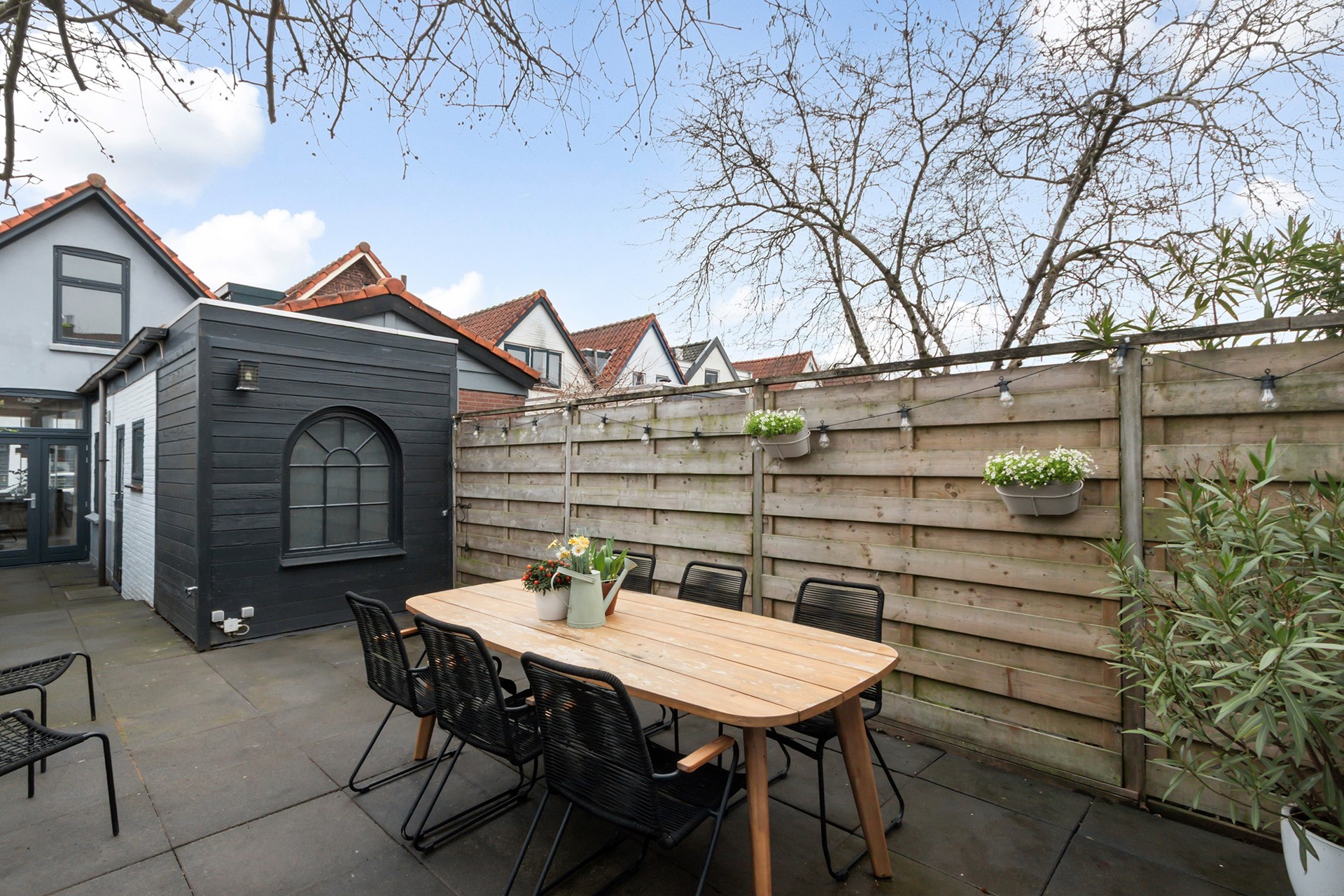 De besloten achtertuin is geheel bestraat en ligt op het noordwesten. Door de ligging en lengte van de tuin kun je hier in de meeste maanden van het jaar, van einde ochtend tot avond heerlijk genieten van de zon.