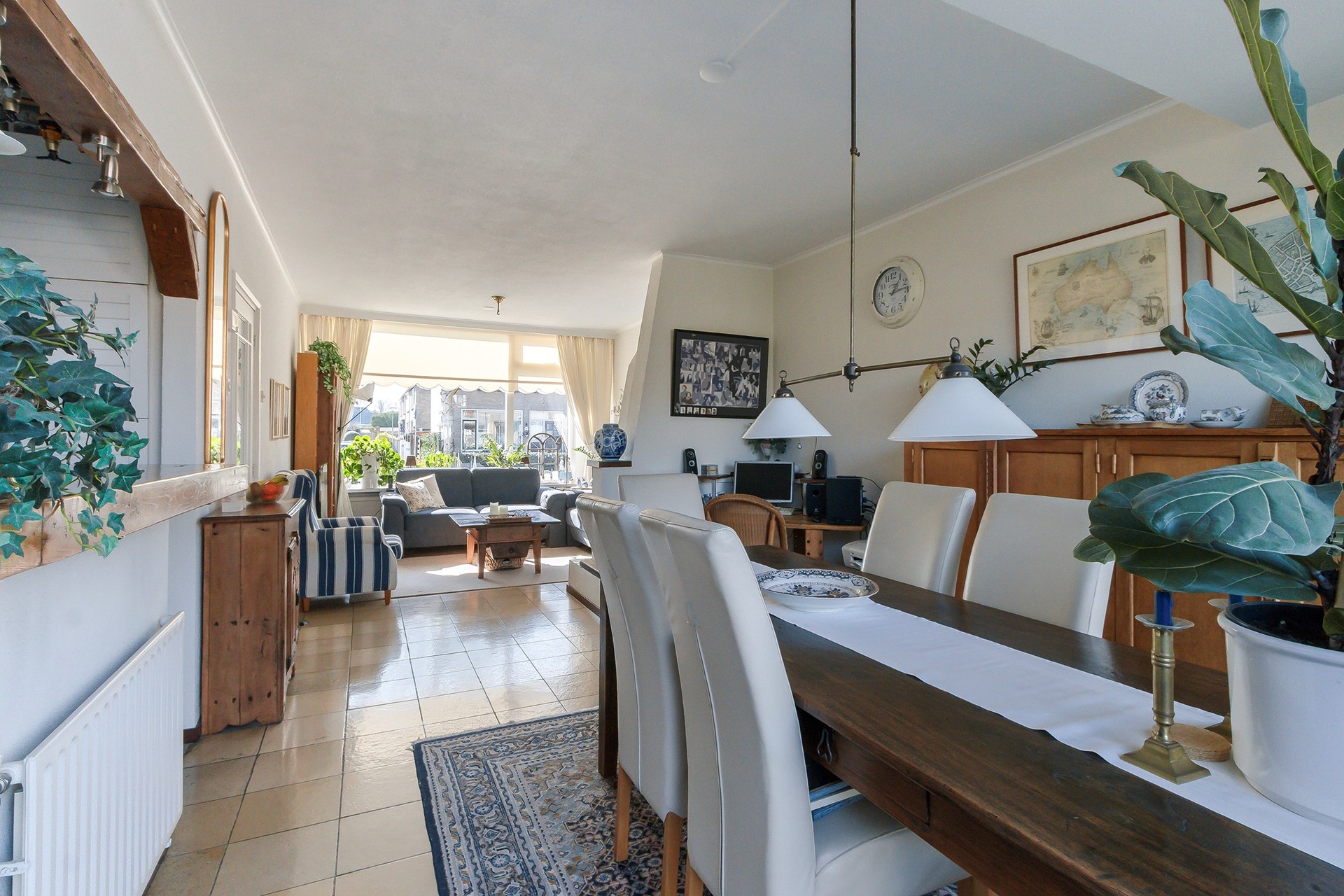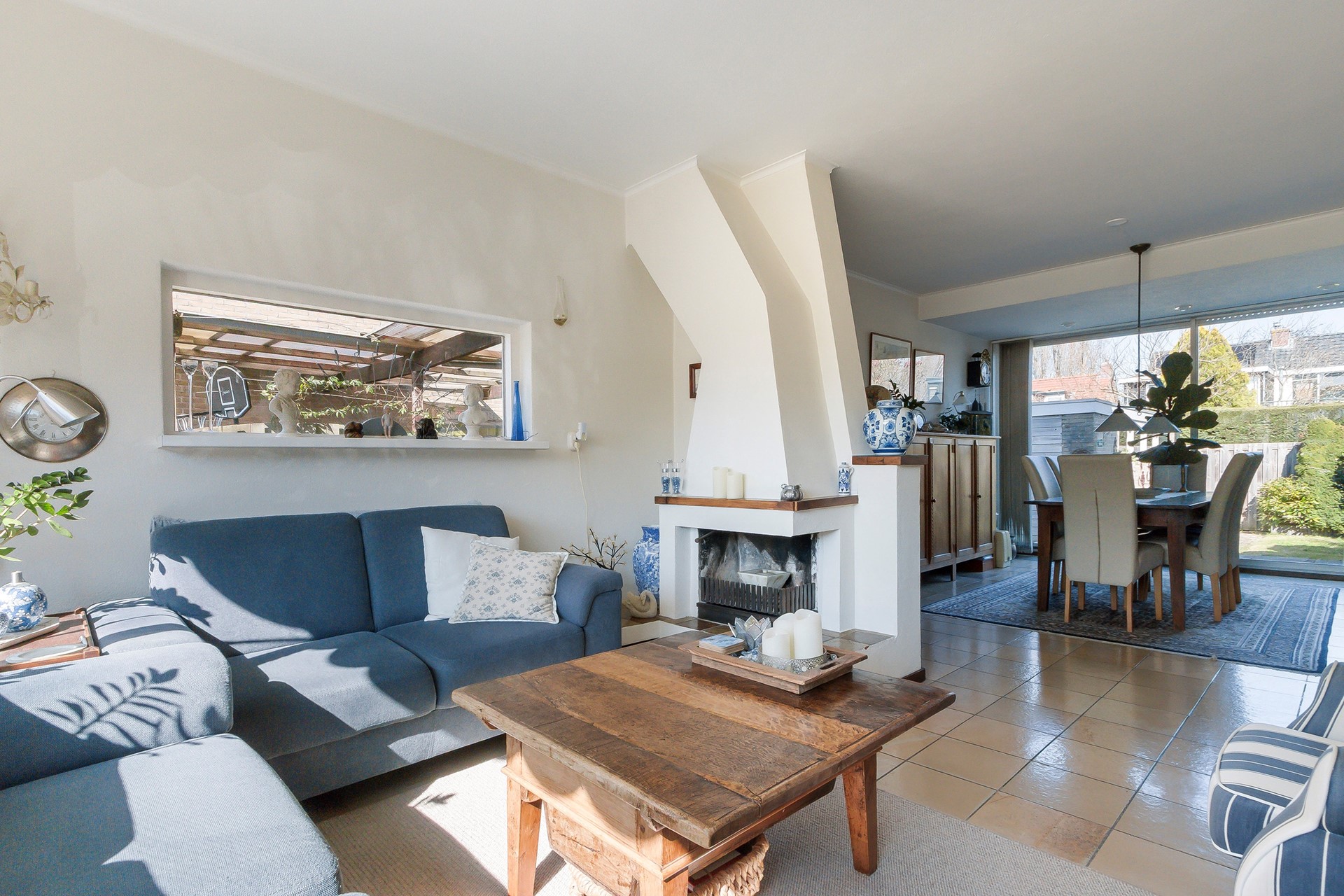 U stapt binnen in de ruime en lichte woonkamer. Het extra raam in de zijgevel zorgt voor een fijne lichtinval. De open haard geeft extra sfeer aan deze ruimte.