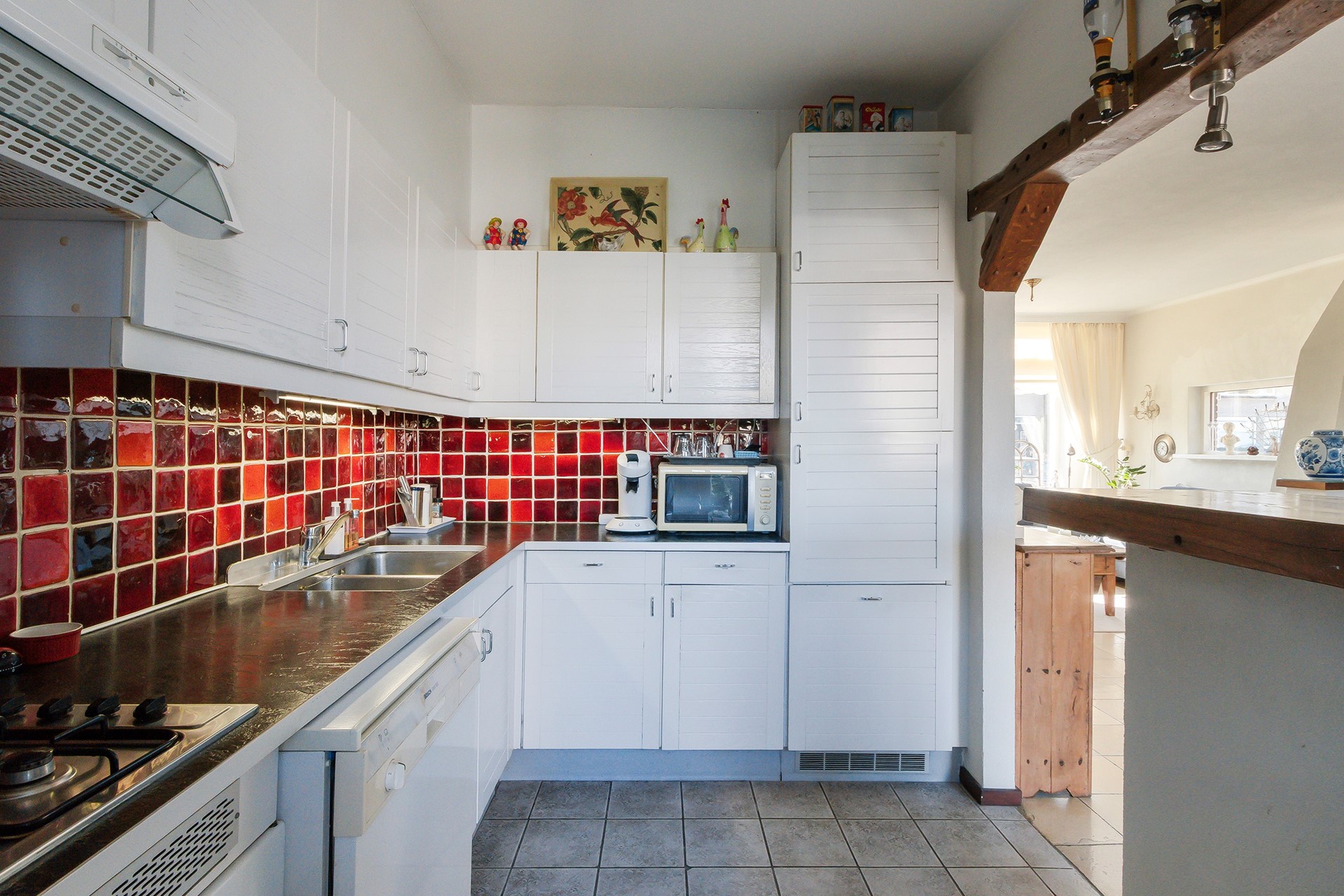 De open keuken aan de achterzijde van de woning is functioneel en is voorzien van een 4-pits gaskookplaat met afzuigkap, oven, vaatwasser en een koel-/vriescombinatie.