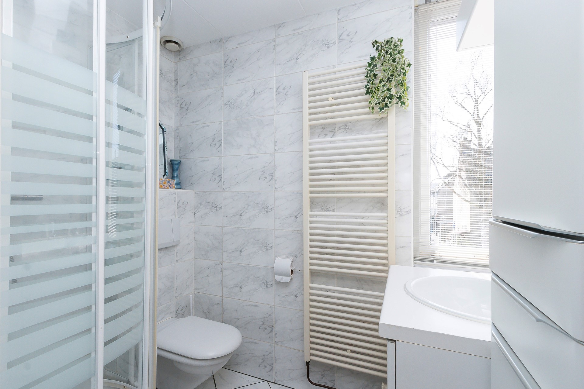 De badkamer is geheel betegeld en uitgerust met een douche, toilet, wastafelmeubel en extra kast. Het raam zorgt voor een prettige natuurlijke lichtinval.