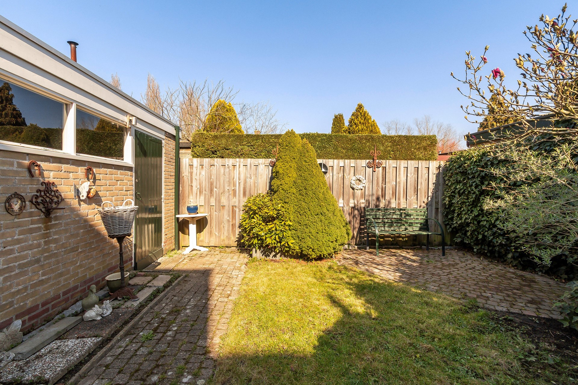 De heerlijke achtertuin ligt op het noordoosten en is omheind. De tuin is gedeeltelijk bestraat en er staan veel vaste planten en struiken, waaronder een prachtige Magnolia.