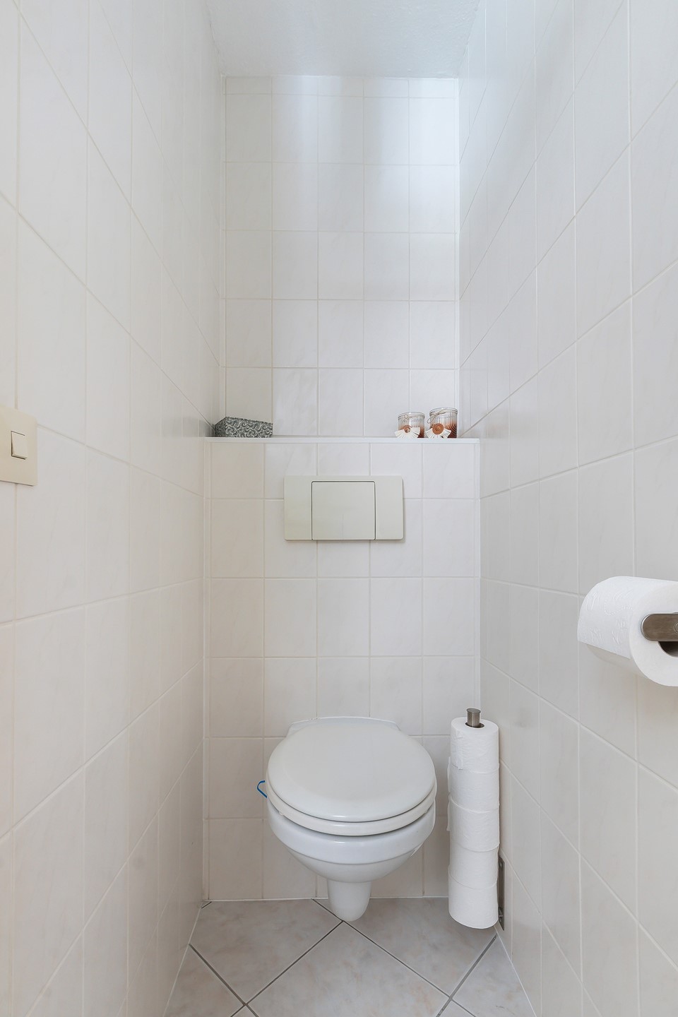 Het keurige toilet is geheel betegeld en heeft een hangcloset. In de naastgelegen berging is de cv-installatie te vinden, evenals de aansluitingen voor de wasmachine en droger. De bergkast biedt daarnaast ook nog veel opbergruimte.