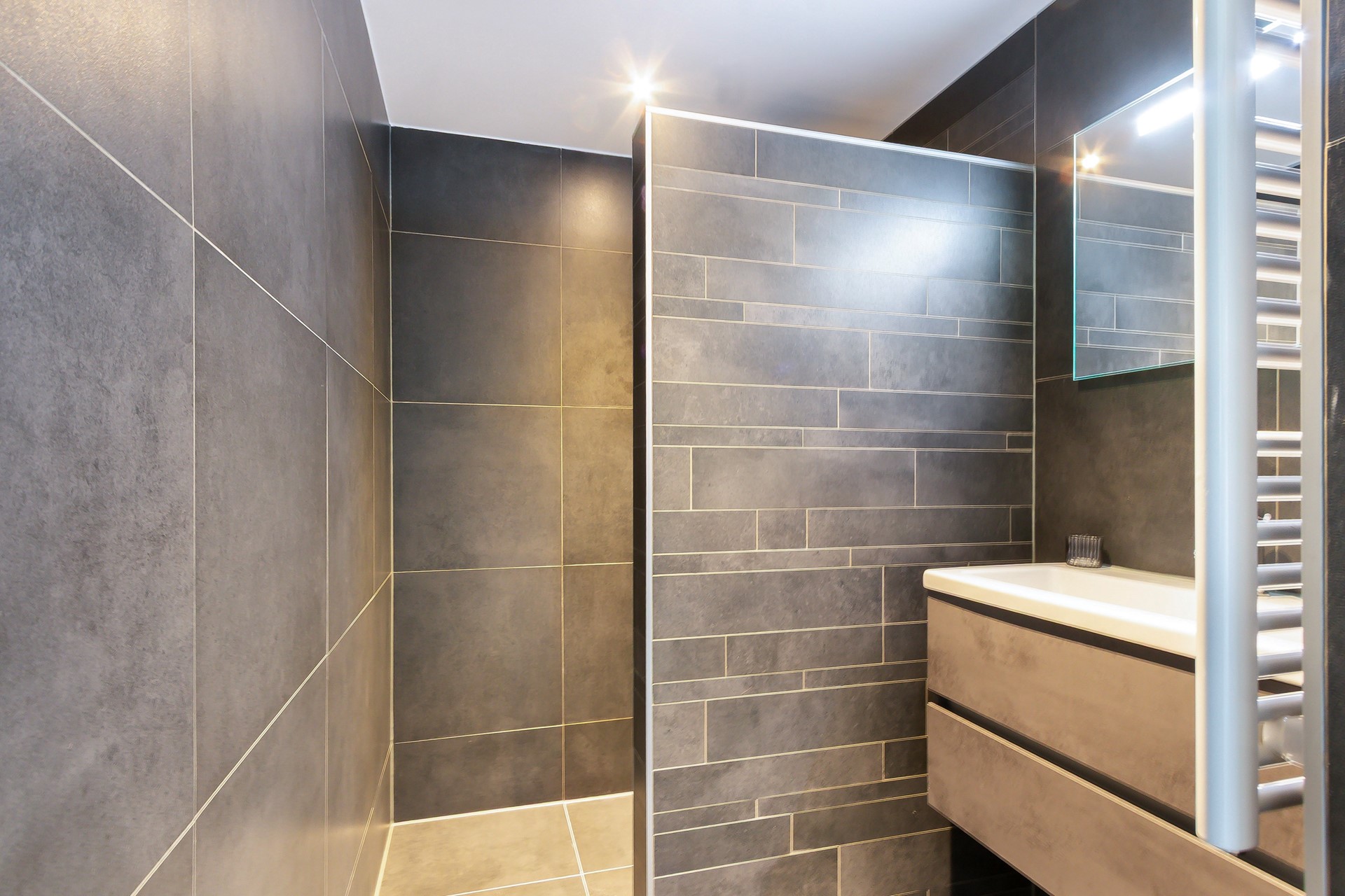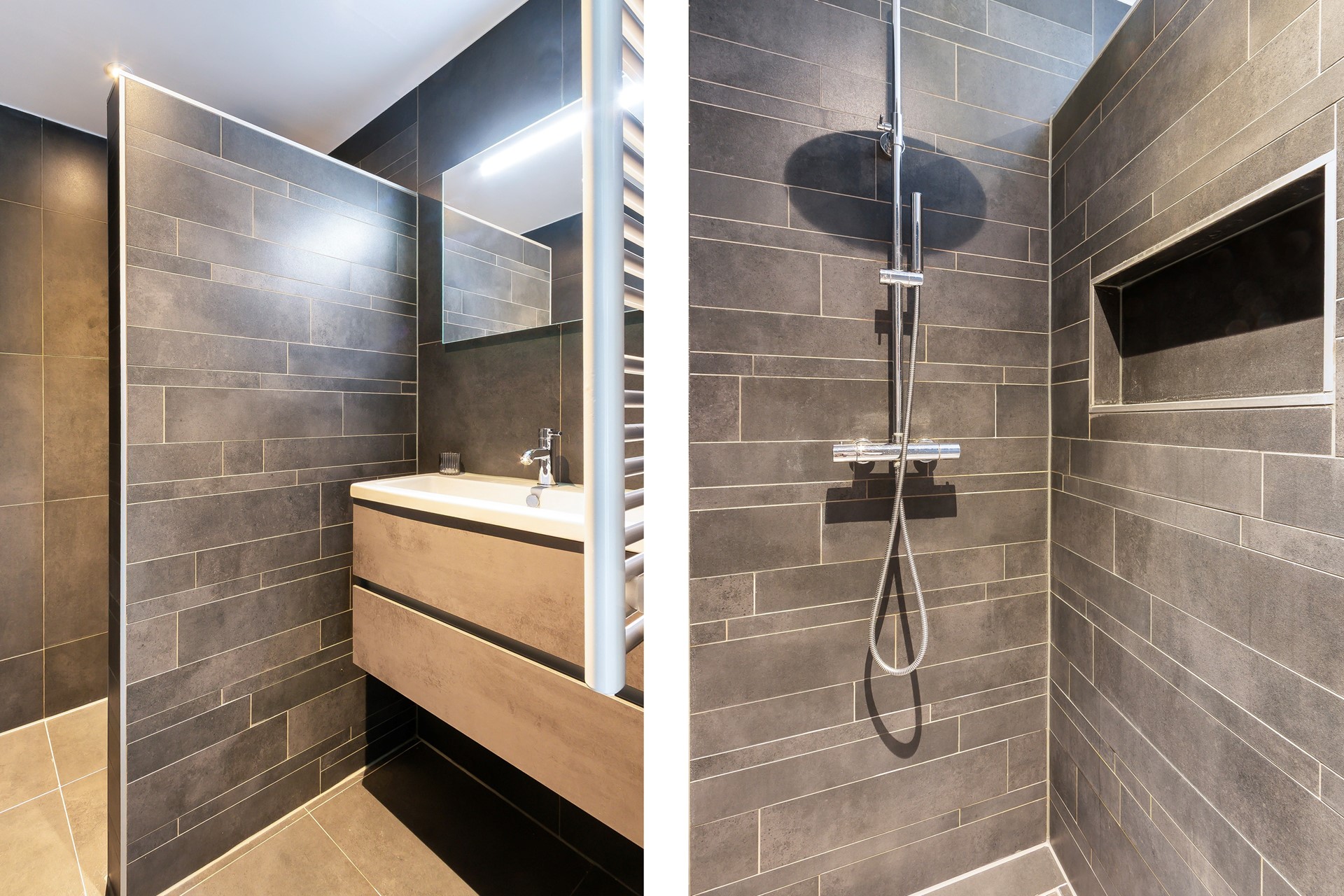 De moderne badkamer is vernieuwd in 2020 en geheel betegeld. De donkere tegels geven een stoere look. Er is een ruime inloopdouche met regendouche, handdouche en een drain. Daarnaast is er een mooi wastafelmeubel.