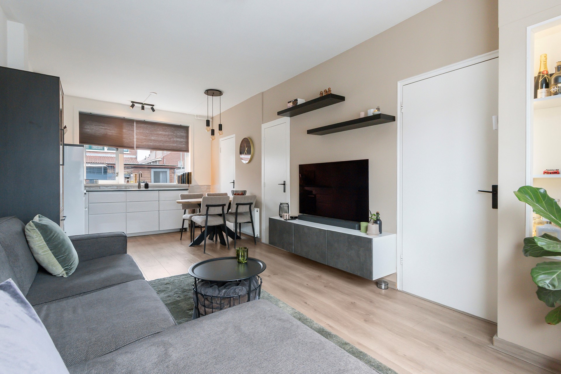 De woonkamer heeft een fijne lichtinval door de grote ramen aan weerszijden van de woning. Het hoge plafond zorgt daarnaast voor een ruimtelijke beleving. Het zitgedeelte aan de voorzijde heeft een leuke nis. De open keuken is het verlengde van het woongedeelte en bevindt zich aan de achterzijde. Er is tevens een handige provisiekast aanwezig.