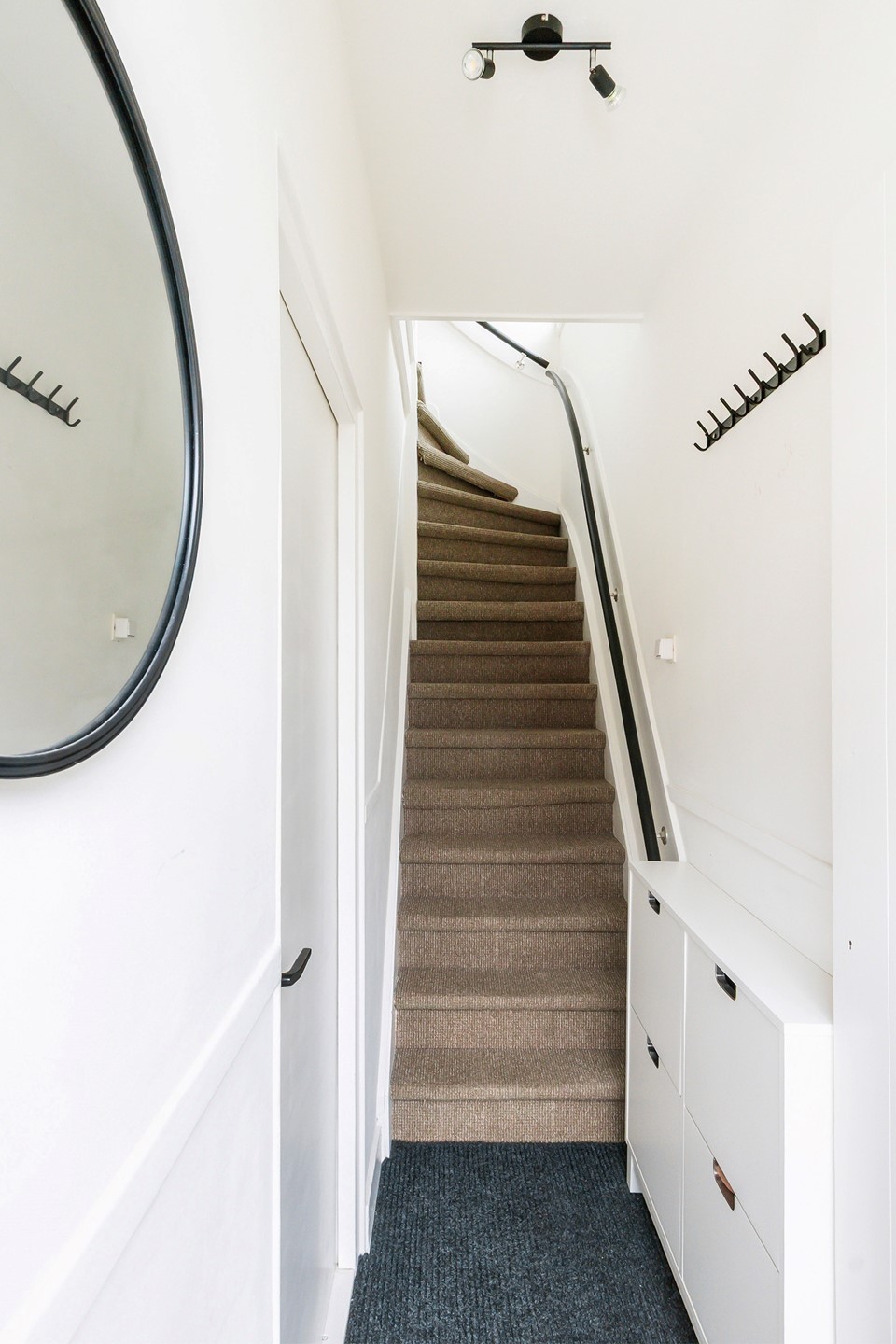 Je stapt binnen in de hal met meterkast, de vaste trap naar de eerste verdieping en de toegang naar de woonkamer.