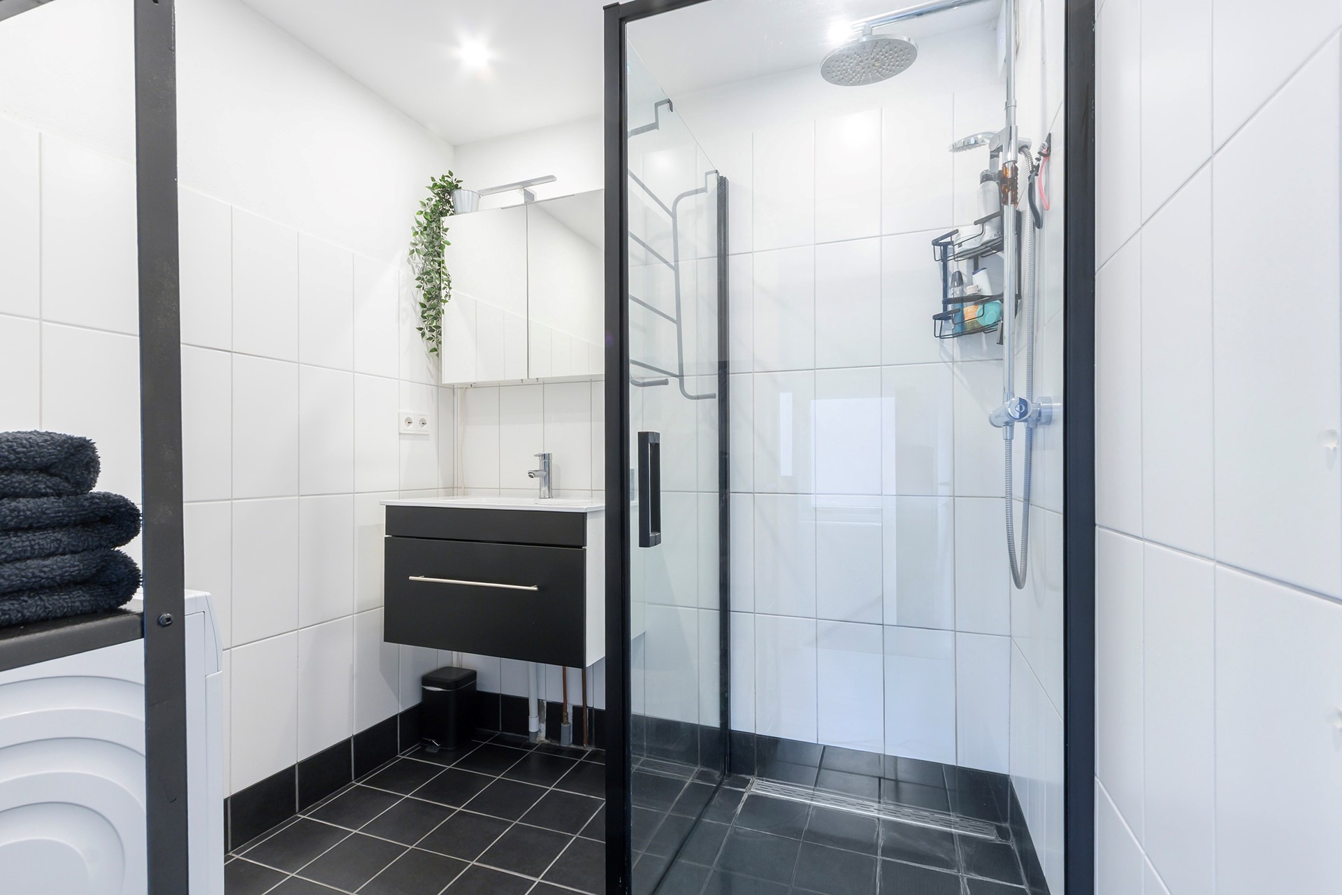 De moderne badkamer is voorzien van een grote inloopdouche (rainshower), een wastafelmeubel en mechanische afzuiging. Ook is hier de opstelplaats voor de wasmachine.