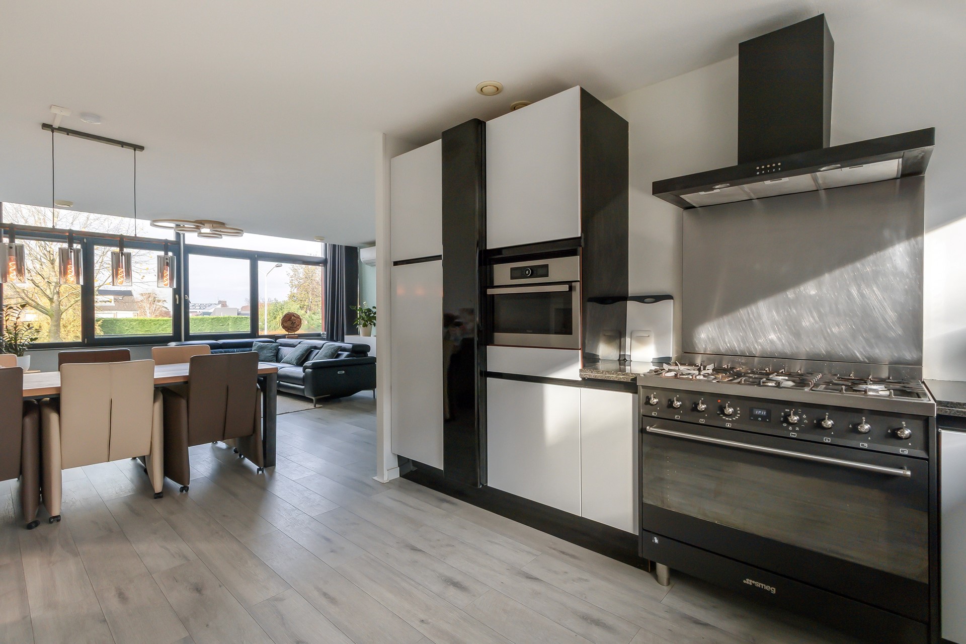 Deze open keuken bevindt zich aan de voorzijde van de woning. Het brede 6 pits SMEG gasfornuis met oven springt direct in het oog. Daarnaast zorgt de hoekopstelling voor veel werk- en bergruimte. Het granieten werkblad geeft deze keuken een kwalitatieve en tijdloze uitstraling. Naast de grote oven is er ook een combi-oven, vaatwasser (2025), apothekerskast en koelkast met vriesgedeelte. Het grote raam heeft een screen.